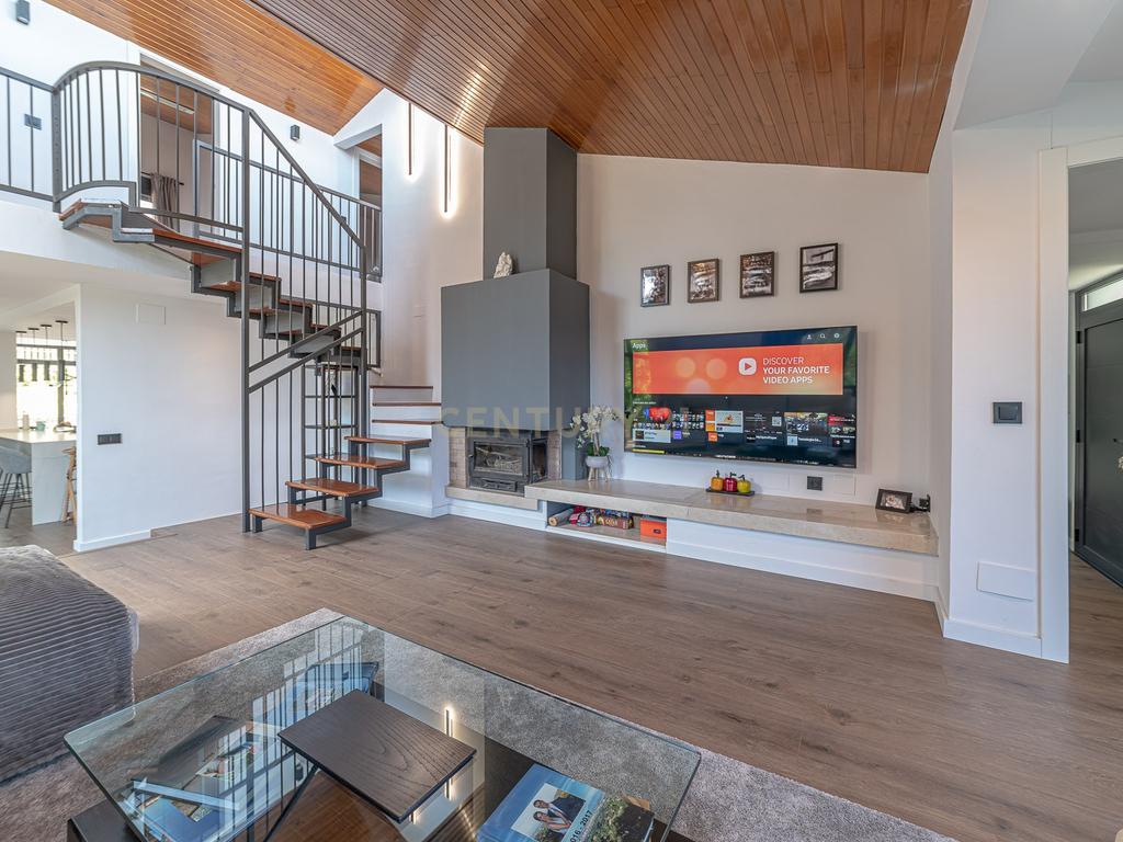 La distribución incluye un amplio salón, una cocina moderna equipada, y un elegante comedor. Además, cuenta con 3 plantas y un jardín privado con vistas a la montaña, ideal para relajarse y disfrutar del aire libre. Las características como aire acondicionado, calefacción por suelo radiante y una chimenea añaden un toque de lujo y confort.